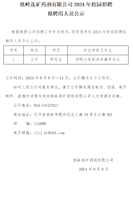 鐵嶺選礦藥劑有限公司2024年校園招聘 擬聘用人員公示